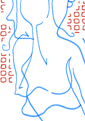 Mann könnte die von Frau (s) ausgehende (x-y-z) Denklinie als auf Mann (i) bezogen interpretieren, vielleicht meint sie aber auch das ganze Beziehungsgeflecht? Auf jeden Fall setzt sich ihre Denklinie fort und endet in einer Denkwolke über ihrem Haus: sie denkt über ihre Situation nach, vielleicht darüber, ob sie ihr Elternhaus verlässt?